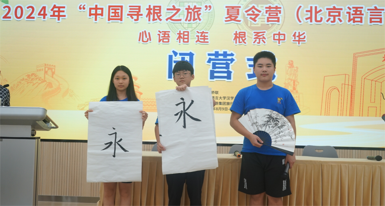 来自意大利、法国、荷兰、泰国等10个国家的38名华裔青少年结束了在北京的寻根之旅,在闭营仪式上,营员们用男生朗诵《将进酒》、书法展示《‘永’字八法》、《皮影中的中国传统节日》、大合唱《但愿人长久》等节目,表达了对中华文化的热爱以及不舍之情。