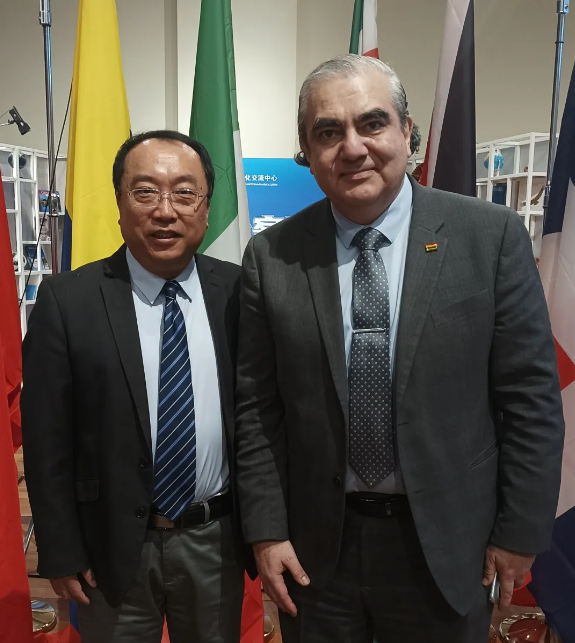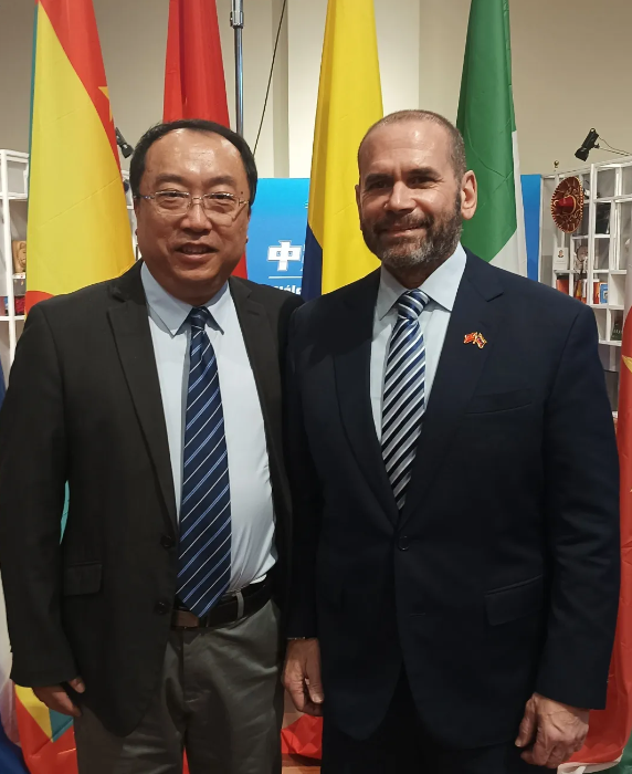 我校汉学与中国学学院党委书记马铁石与活动中偶遇的尼加拉瓜、阿根廷、委内瑞拉和玻利维亚等国驻华大使进行了友好交流。马铁石书记表示,非常欢迎拉美国家的学生到北京语言大学汉学与中国学院、国际中文学院和应用中文学院学习相关专业,成为优秀的汉学及汉语人才,未来服务于各领域的合作项目。他同时表示欢迎拉美国家知名学者和汉学家在是时间和条件允许的情况下访问北京语言大学,就多领域的交流与合作进行磋商。