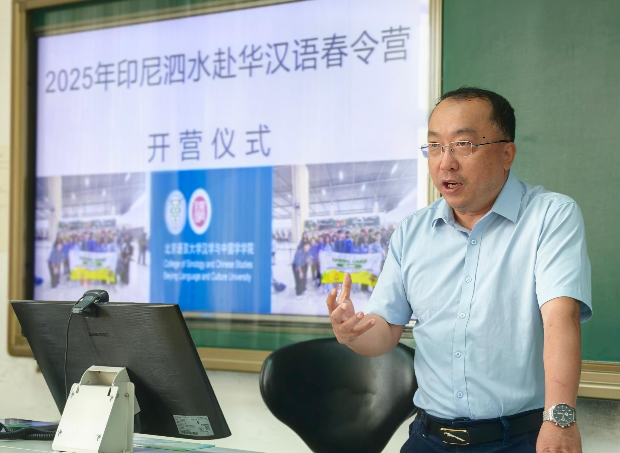 马铁石书记在致辞中首先对印度尼西亚学员的到来表示热烈的欢迎,印尼是东盟国家中重要的一员,在促进本地区经贸发展和文化交流方面发挥了积极的作用,语言是文化交流的桥梁,此次春令营是增进两国青年相互了解、深化友谊的重要契机;他向学员们介绍了北京语言大学在国际中文教育领域的深厚积淀与独特优势,学校多年来致力于传播中国语言文化,培养了大量精通中文、了解中国的国际人才,鼓励学员们珍惜此次学习机会,积极融入校园生活,在提升汉语水平的同时,深入体验中国文化的魅力;介绍了汉学与中国学学院的基本情况,特别是在人才培养方向上做了重点的说明。他还表示,学校将全力为学员们提供优质的教学资源和周到的服务保障,希望大家能在北京语言大学度过一段充实、难忘且收获满满的时光。